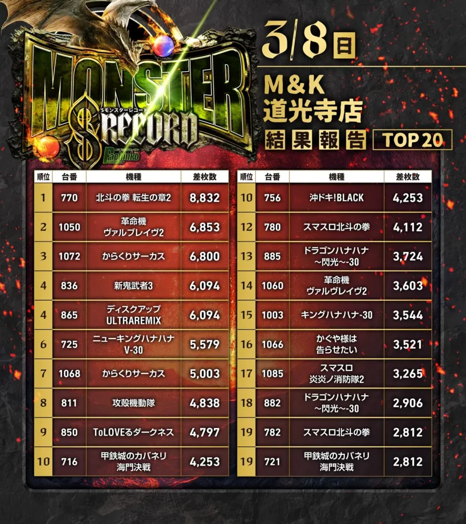 3/8 M&K道光寺店 Sモンスターレコード 差枚数ランキング