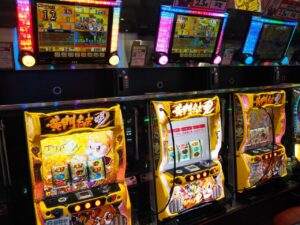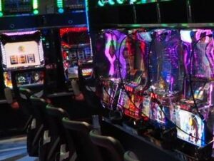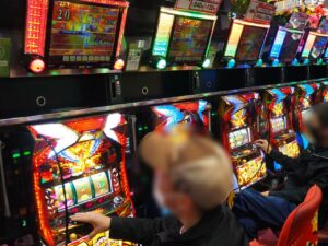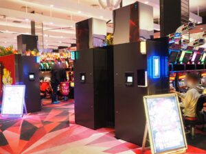 景品カウンターから店内を見渡すと真っ先に目に止まる、総数100台の沖スロコーナー。